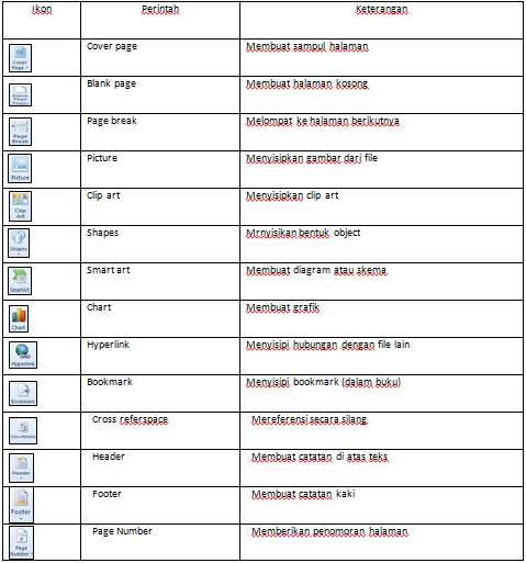 Pada tab ribbon Insert terdapat ikon - ikon di antaranya: